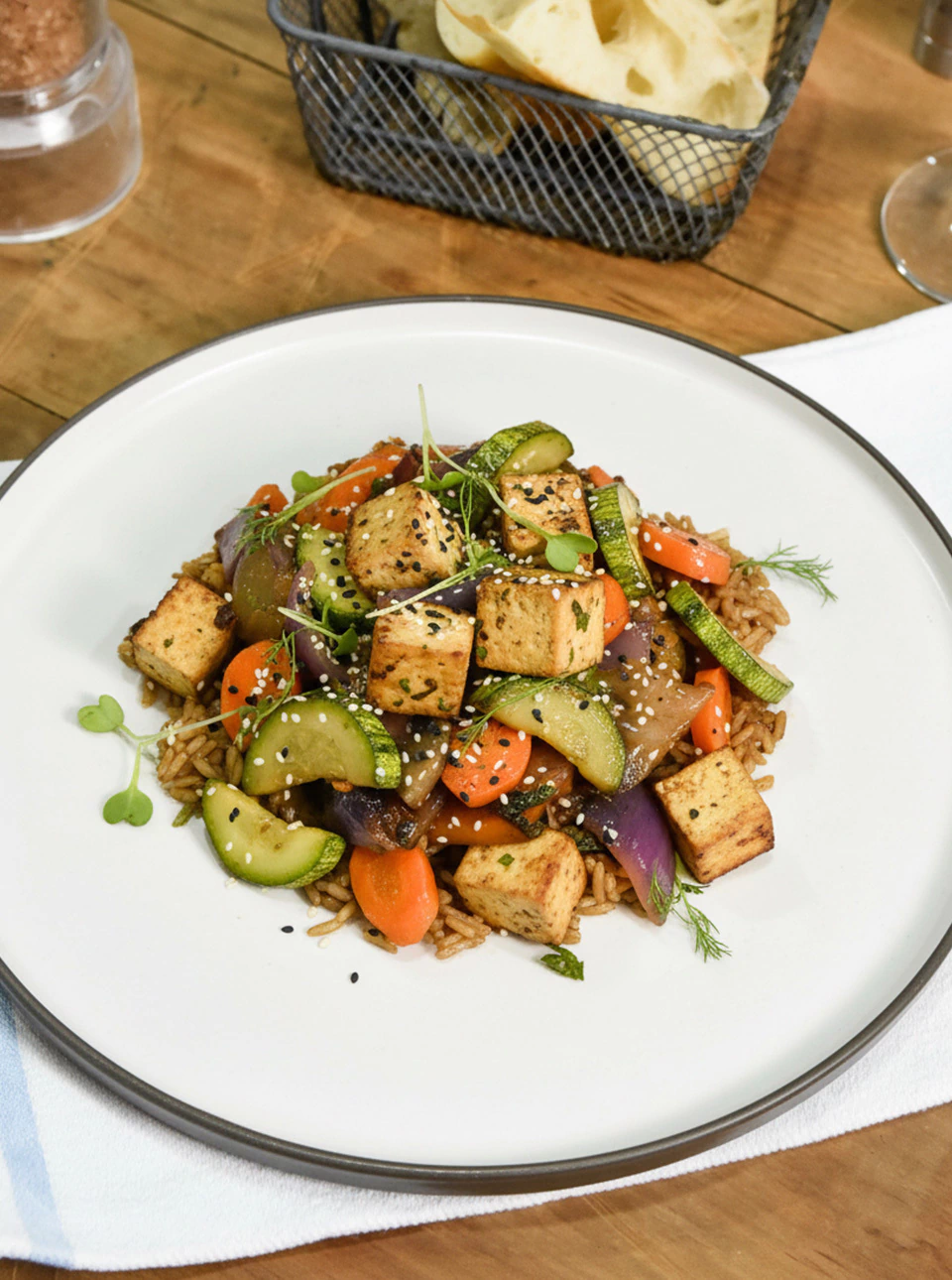 Ingredientes: Tofu, arroz, cebolla, zucchini, zanahoria, morrón, cebolla de verdeo, cilantro, salsa ponzu, aceite de sesamo, salsa de soja, aceite de oliva, jengibre, semillas de sésamo, ajo, sal, pimienta.